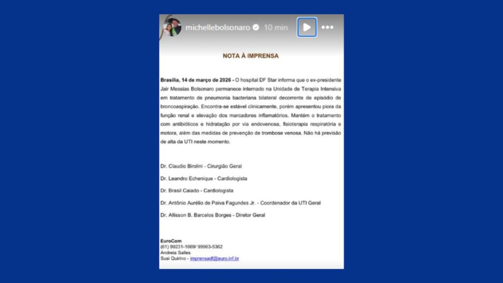 Bolsonaro está hospitalizado desde sexta-feira (13), após passar mal durante a madrugada, na prisão. Os médicos diagnosticaram pneumonia bacteriana bilateral causada por broncoaspiração, condição que ocorre quando substâncias do estômago ou da boca entram nas vias respiratórias.