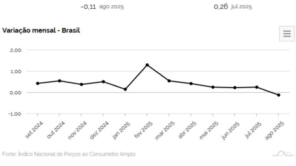 A inflação oficial do país apresentou deflação de 0,11% em agosto, conforme divulgou o Instituto Brasileiro de Geografia e Estatística (IBGE) nesta quarta-feira (10). Trata-se da primeira taxa negativa do Índice Nacional de Preços ao Consumidor Amplo (IPCA) desde agosto de 2024 e a mais intensa desde setembro de 2022, quando o indicador recuou 0,29%.