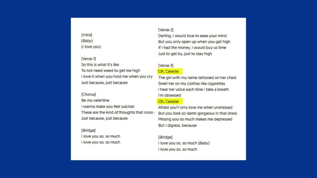 Em tradução livre, a canção diz: “Oh, Celeste / A garota com meu nome tatuado no peito / Sinto o cheiro dela nas minhas roupas, como cigarro / Ouço a voz dela toda vez que respiro / Estou obcecado”.