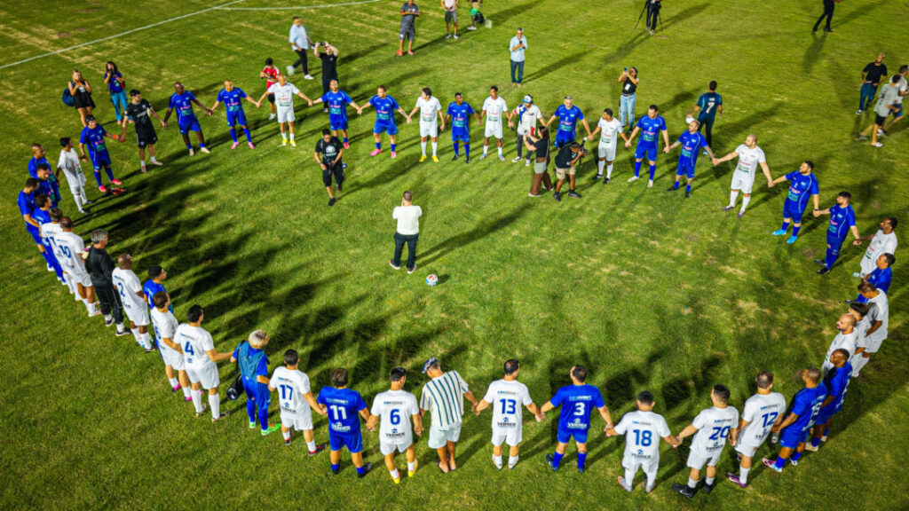 Dentro de campo, o jogo reuniu nomes conhecidos do futebol brasileiro, como Edmilson, Elano, Amaral e Ricardo Oliveira, além do humorista Fausto Carvalho, o Menzinho, que trouxe leveza ao evento.