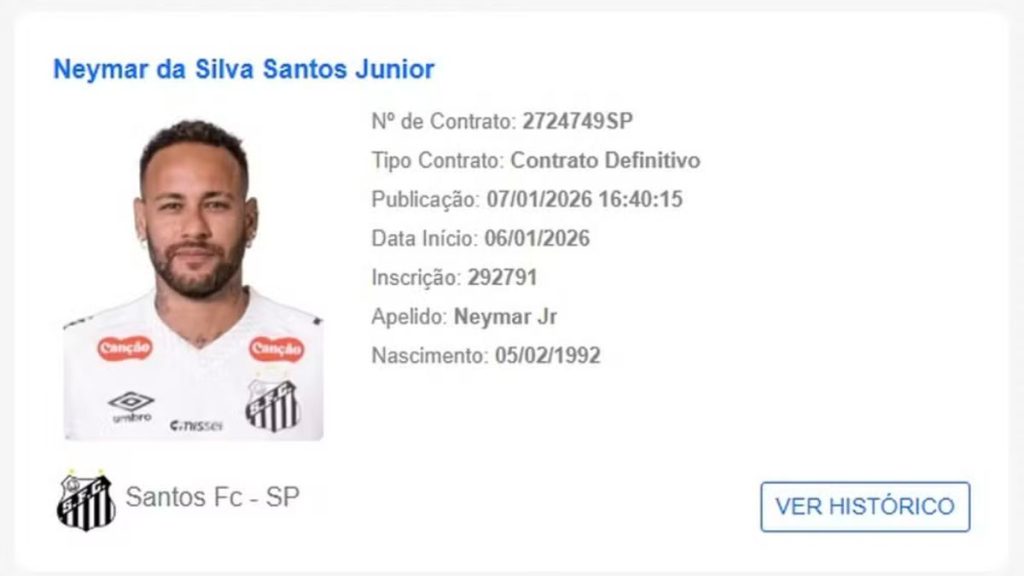 O Santos anunciou que o novo contrato de Neymar foi oficializado no Boletim Informativo Diário (BID) da CBF, tornando o atacante novamente apto a defender o clube em 2026.