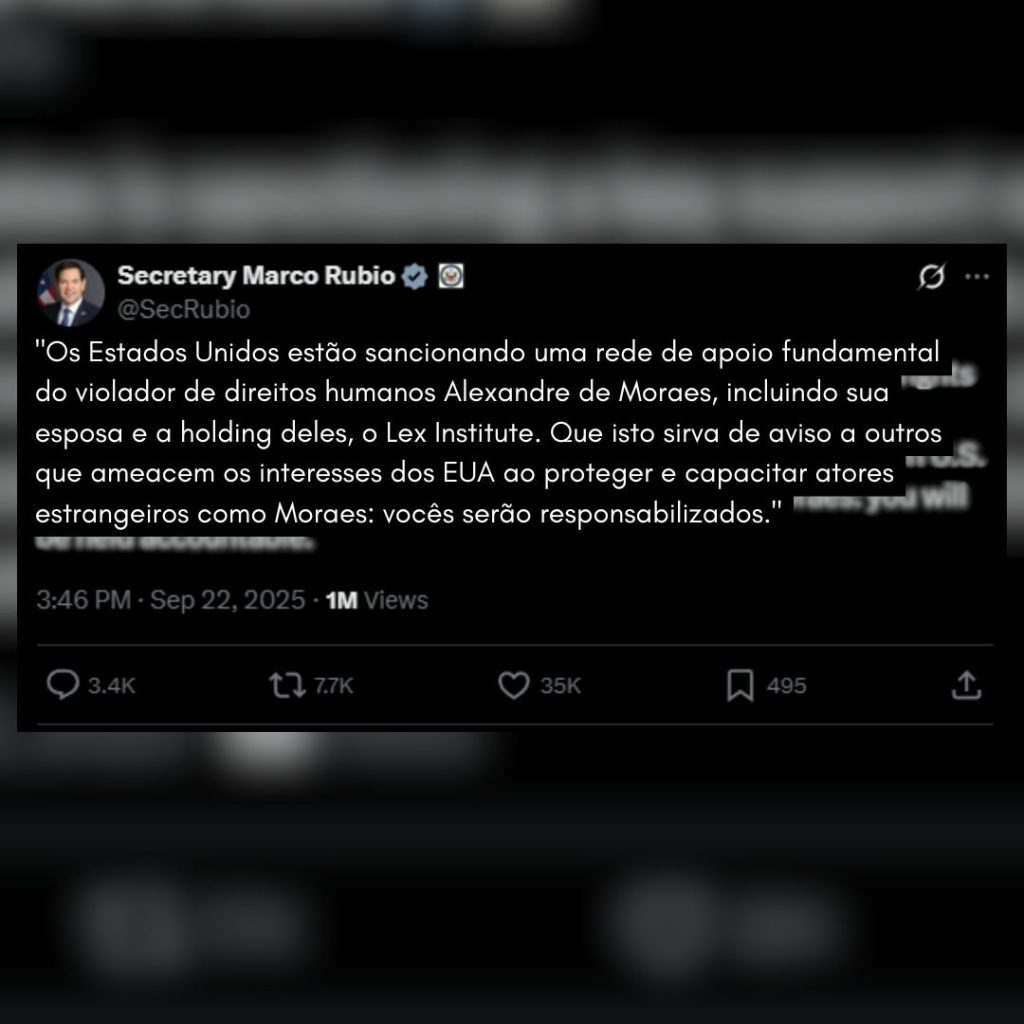 The United States is sanctioning a key support network of human rights abuser Alexandre de Moraes, to include his wife and their holding company, Lex Institute. Let this be a warning to others who threaten U.S. interests by protecting and enabling foreign actors like Moraes: you…