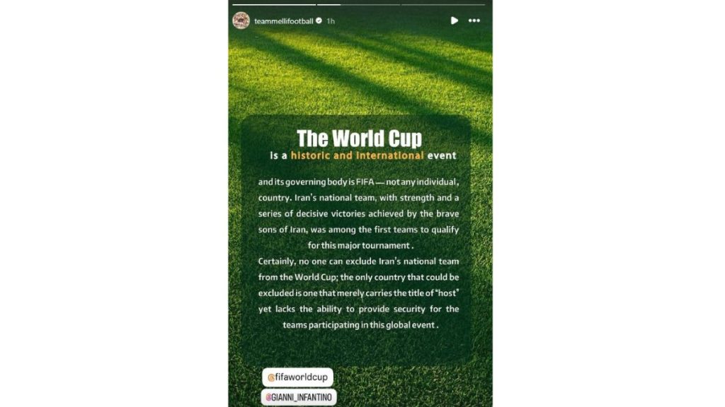 “A Copa do Mundo é um evento histórico e internacional e seu órgão regulador é a Fifa – não qualquer indivíduo ou país. A seleção nacional do Irã, com sua força e uma série de vitórias decisivas conquistadas pelos bravos filhos do Irã, esteve entre as primeiras equipes a se classificar para este grande torneio. Certamente, ninguém pode excluir a seleção nacional do Irã da Copa do Mundo; o único país que poderia ser excluído é aquele que ostenta apenas o título de “anfitrião”, mas não tem capacidade para garantir a segurança das equipes participantes deste evento global”, publicou o perfil oficial da seleção do Irã no Instagram.
